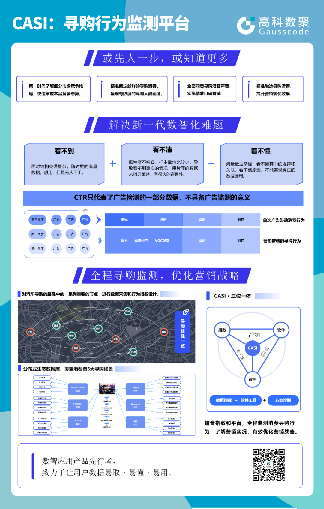 以汽车行业为例,CASI将在寻车、比车、研究、到店、试驾、促销等一系列洞察消费者行为的重要场景和节点进行数据分析,并将消费者行为数据指数化。顺利获得将大数据与小数据的能力优势进行有效结合,将帮助企业理解市场需求和消费者行为的变化趋势,实现全渠道客户寻购行为还原,帮助车企对寻购引导和销售资源的部署进行合理优化,准确制定决策方案精准触达目标客户。